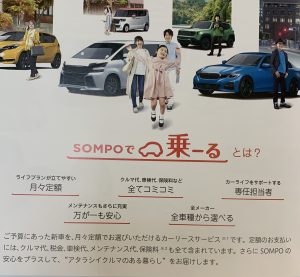 SOMPOで乗ーる(そんぽでのーる)取り扱っています。お客様が災害や事故、疾病でお困りの時に私達は安心と安全そしてそのご繁栄に全力疾走します。その為に社員全員がコンサルティング能力・業務能力・事故対応能力を業界最高水準に押し上げます。